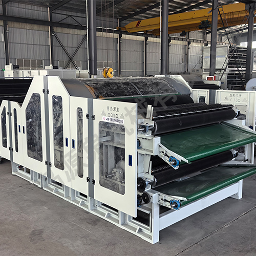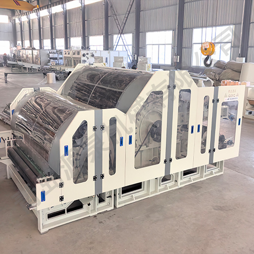 該機(jī)采用雙錫林梳理,雙道夫,雙雜亂出棉,雙羅拉剝棉,具有分梳能力強(qiáng),梳理精度高等優(yōu)點(diǎn)。喂入羅拉分上下兩組配對,變頻調(diào)速,并裝有金屬探測裝置,具有自停報(bào)警功能。且自動送入鋪網(wǎng)機(jī)斜簾,減輕操作工的勞動強(qiáng)度。
